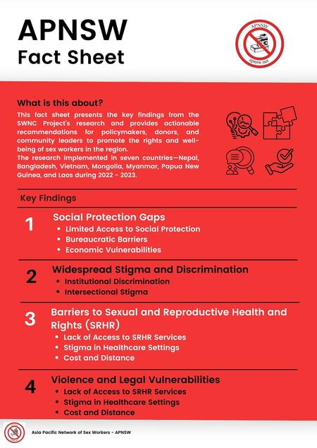 The Sex Worker Network Consortium (SWNC) Project Research Factsheet distills key findings from regional research conducted across Bangladesh, Laos, Mongolia, Myanmar, Nepal, Papua New Guinea, and Vietnam (2022–2023). The factsheet highlights barriers, successes, and actionable recommendations to advance the rights, inclusion, and well-being of sex workers in the Asia-Pacific region.